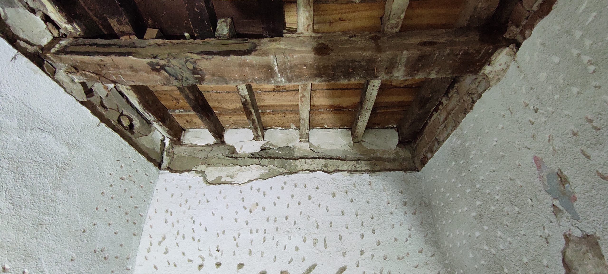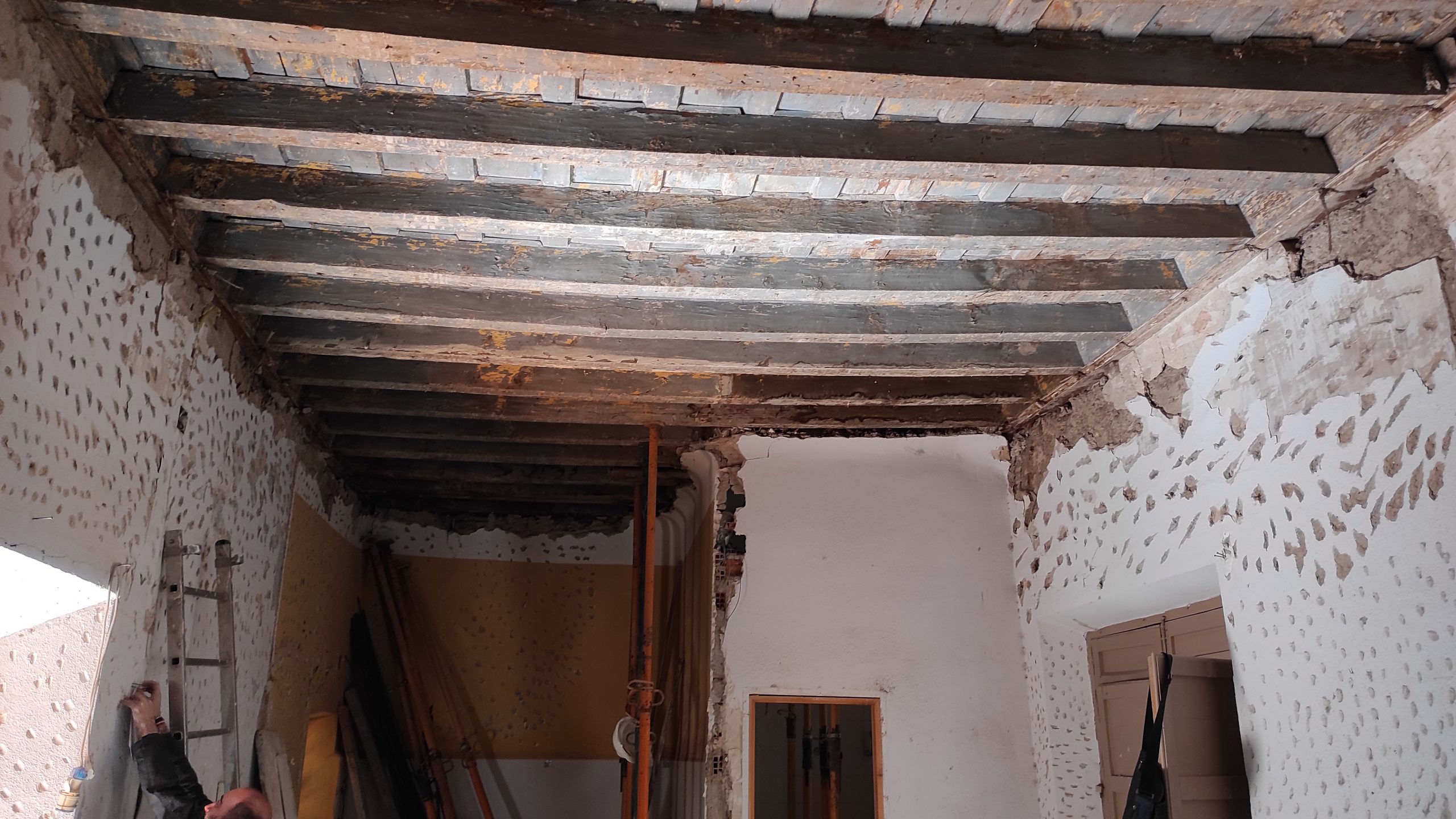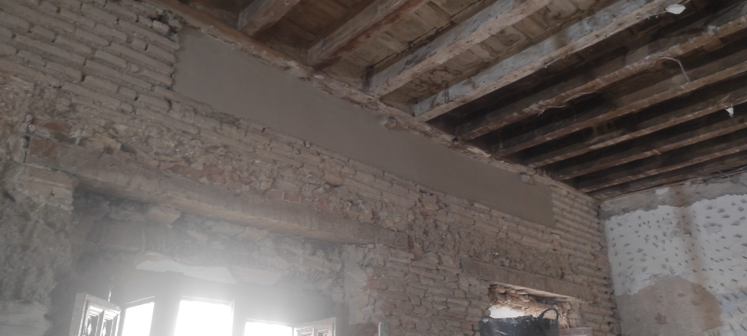 A causas de una obra anterior se hubo que reforzar la estructura del piso superior y parte del propio, dado que se produjo un descenso del piso superior al demoler los tabiques, que no debían ser estructurales. También se reforzó la viguería del alfarje (forjado de madera, tablas y relleno de tierra apisonada) que presentaba una flecha histórica consolidada con el sistema Beta que se trata de reforzar con epóxidos y armadura de fibra de carbono de manera que actúen solidariamente con la madera existente. También se reforzaron los apoyos del alfarje en el muro de carga y se actuó, por debajo, para estabilizar el forjado de techo mediante una estructura metálica que actuase conjuntamente con la de madera existente.