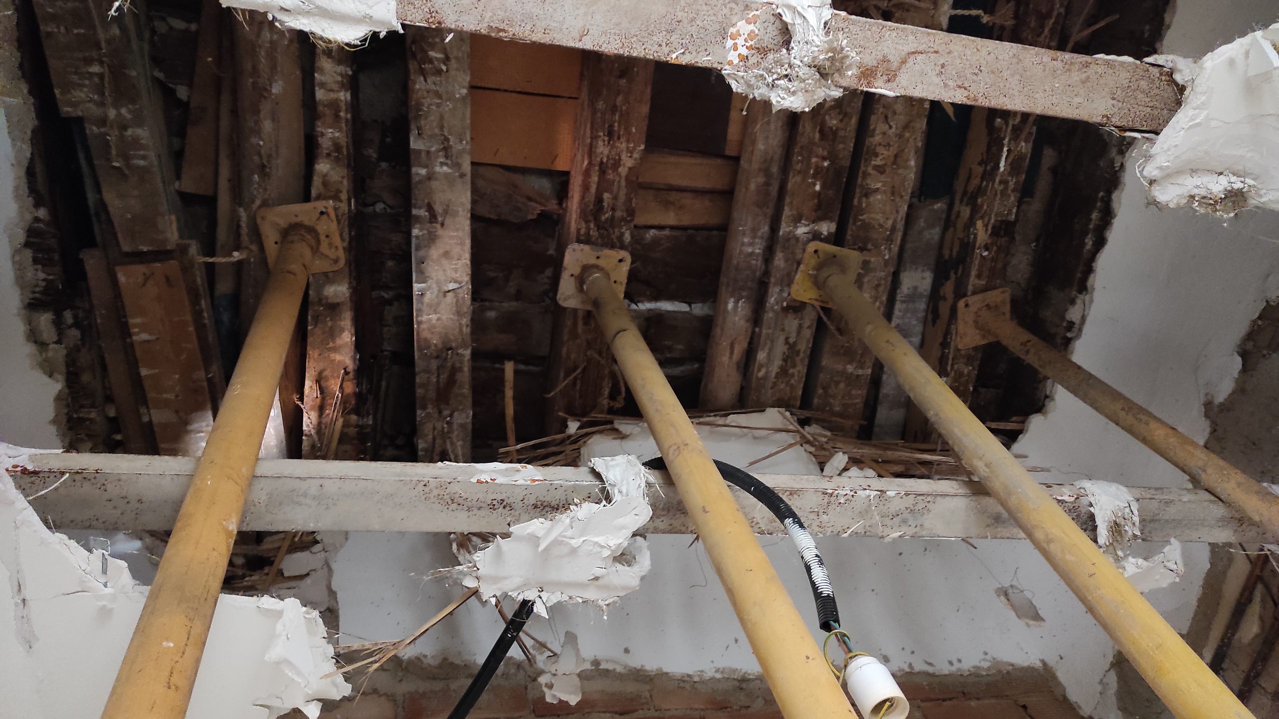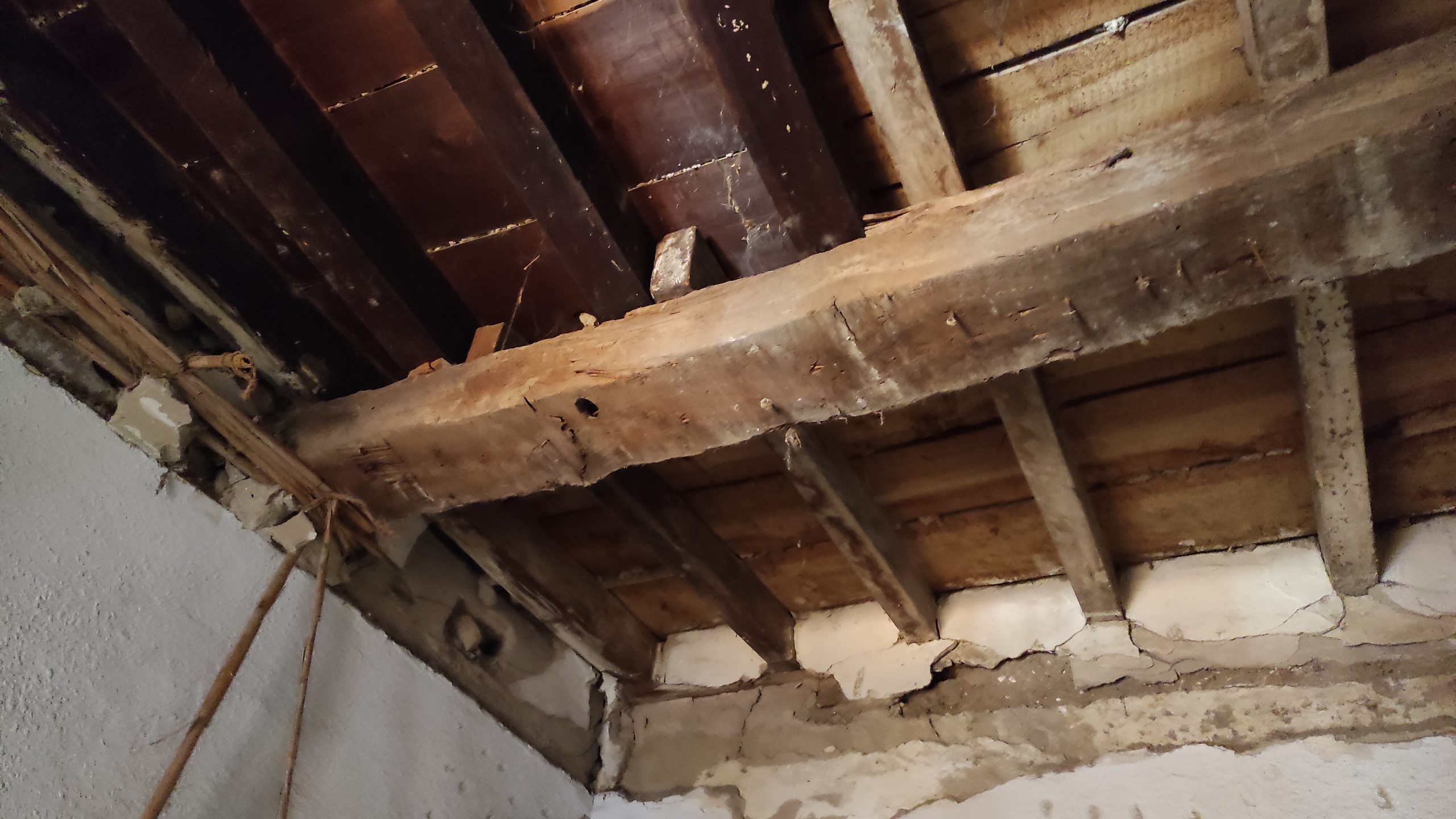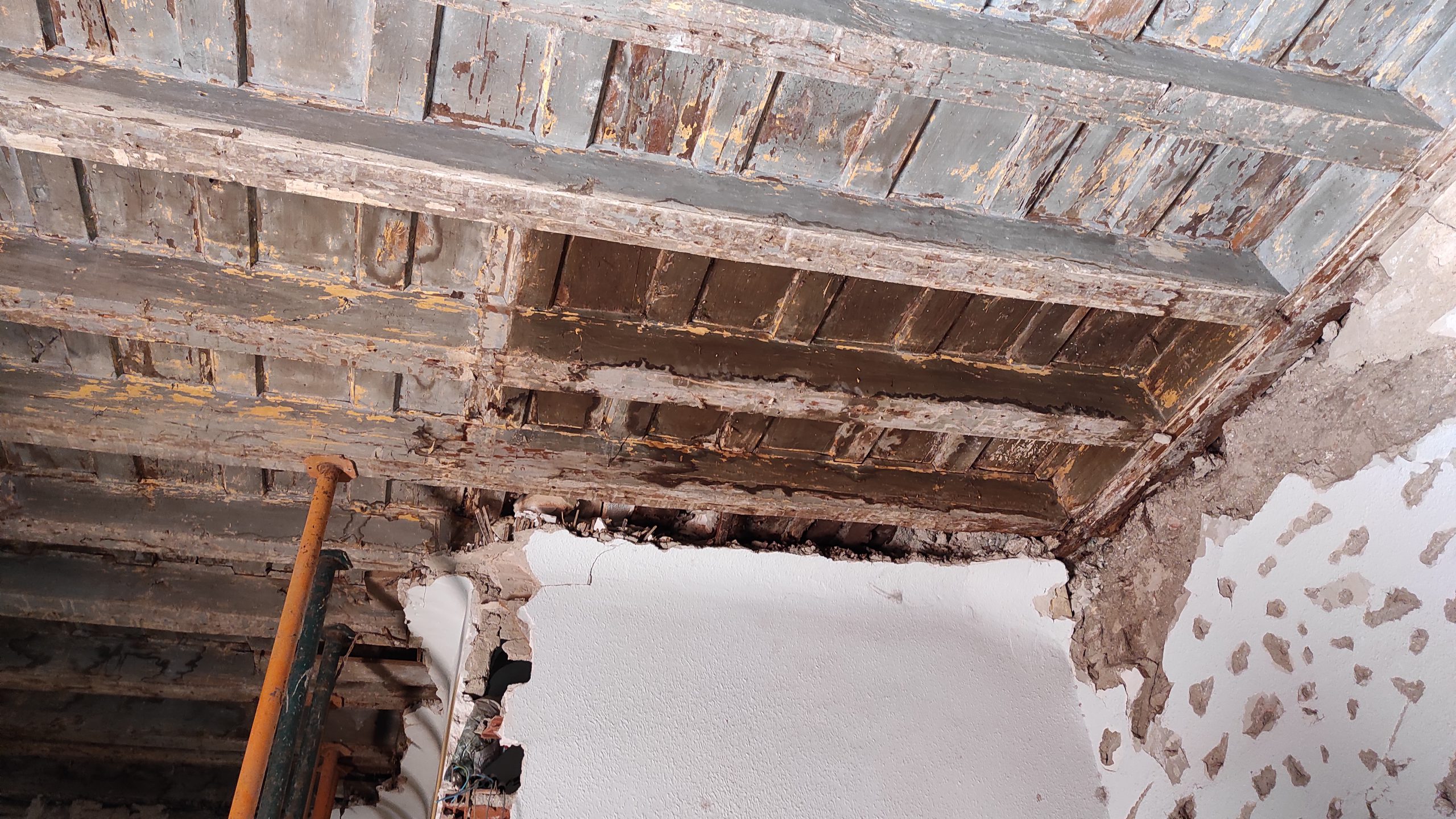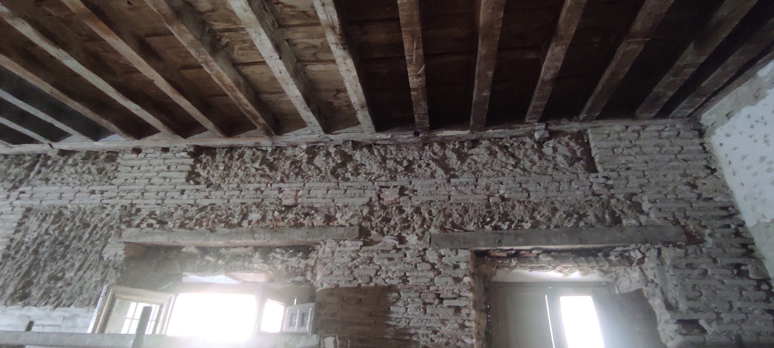 A causas de una obra anterior se hubo que reforzar la estructura del piso superior y parte del propio, dado que se produjo un descenso del piso superior al demoler los tabiques, que no debían ser estructurales. También se reforzó la viguería del alfarje (forjado de madera, tablas y relleno de tierra apisonada) que presentaba una flecha histórica consolidada con el sistema Beta que se trata de reforzar con epóxidos y armadura de fibra de carbono de manera que actúen solidariamente con la madera existente. También se reforzaron los apoyos del alfarje en el muro de carga y se actuó, por debajo, para estabilizar el forjado de techo mediante una estructura metálica que actuase conjuntamente con la de madera existente.
